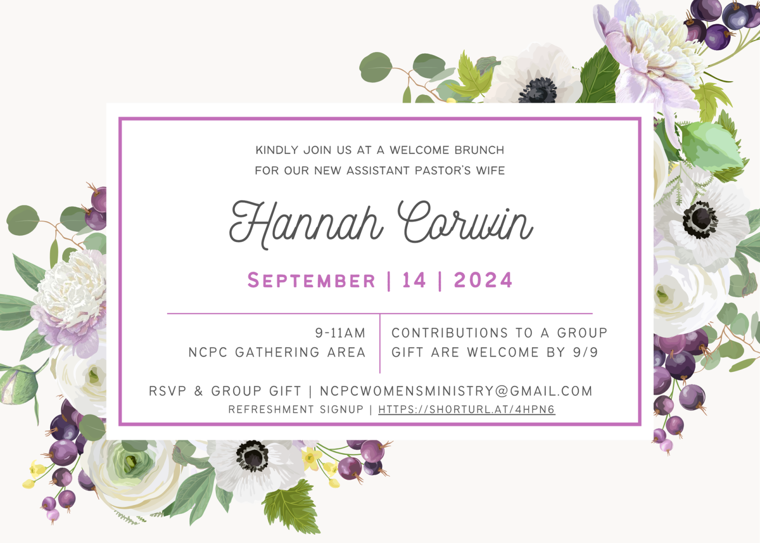 All ladies are invited to join us at a welcome brunch for our new assistant pastor's wife, Hannah Corwin. The brunch will be held in the church gathering area. Contributions to a group gift are welcome by September 9th. Send all replies for gift contributions and RSVP to ncpcwomensministry@gmail.com. Refreshment sign up at via Perfect Potluck.